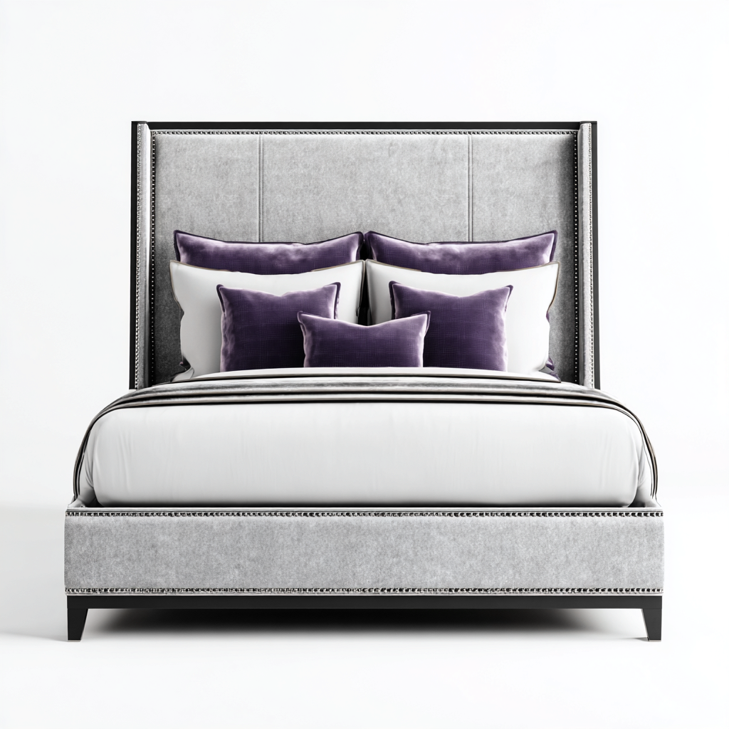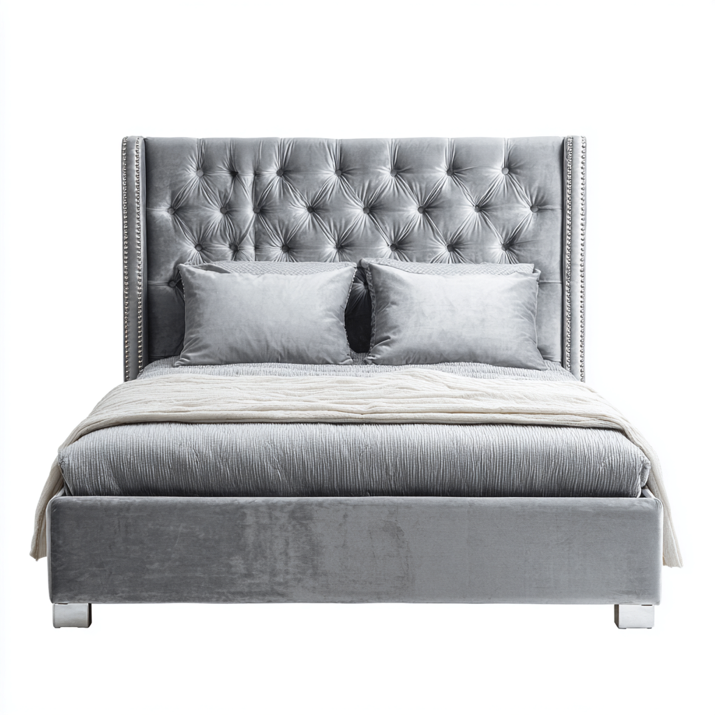 Cama matrimonial tapizada terciopelo 200x160 cm - gris - cabecero alto diseño elegante con tachuelas
