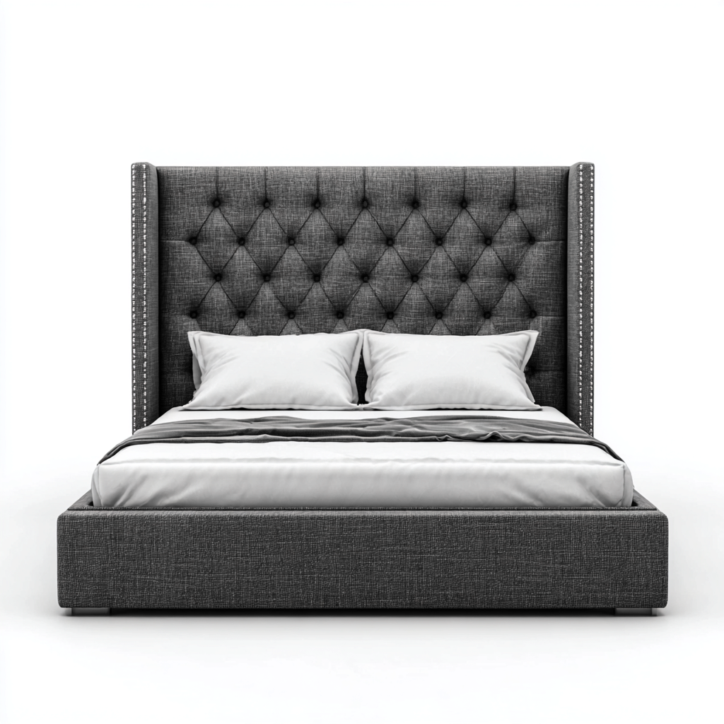 Cama matrimonial tapizada tela 200x160 cm - gris - cabecero capitoné con alas estilo elegante