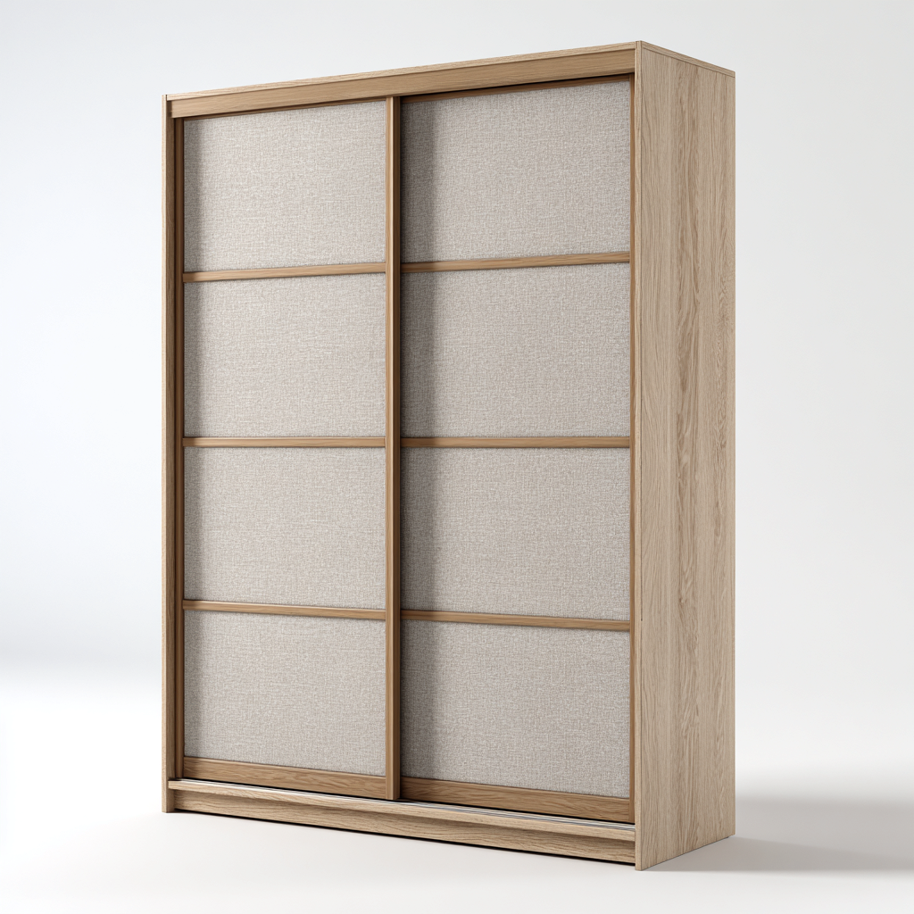 Este armario de puertas correderas combina materiales en tonos neutros para ofrecer una solución de almacenamiento práctica y visualmente equilibrada. Su diseño minimalista encaja con dormitorios modernos y espacios que buscan una estética limpia.