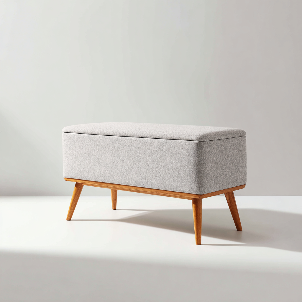 Este banco de dormitorio combina un diseño moderno con un asiento tapizado en tela gris, aportando una solución práctica y equilibrada para el espacio del dormitorio.