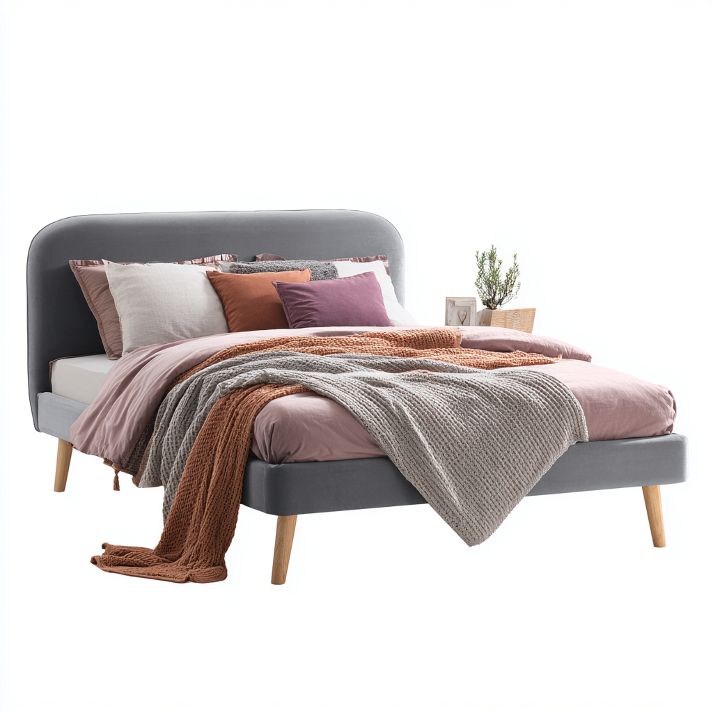 Esta cama matrimonial presenta una estructura tapizada en tono gris suave con un diseño de líneas redondeadas, aportando un estilo moderno y acogedor ideal para dormitorios contemporáneos.