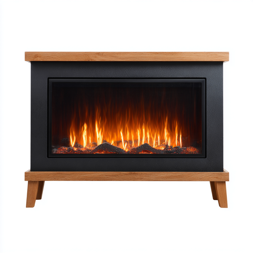 Esta chimenea eléctrica de diseño moderno combina una estructura negra con detalles en madera natural, ofreciendo un efecto de llama realista ideal para crear un ambiente cálido en salas de estar o dormitorios.