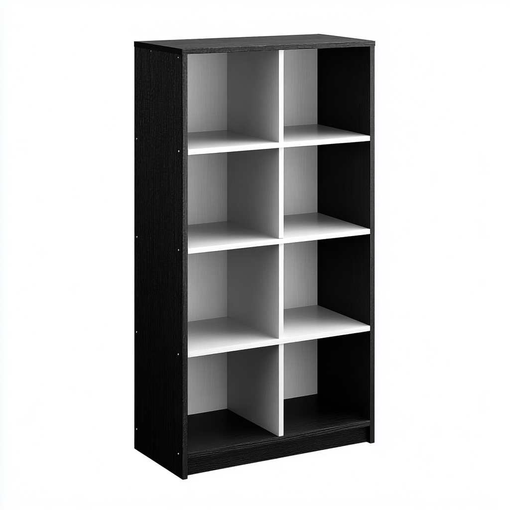 Esta estantería de diseño moderno combina una estructura exterior en color negro con compartimentos interiores en blanco, ofreciendo un contraste elegante y una solución práctica para organizar libros, decoración u objetos cotidianos.