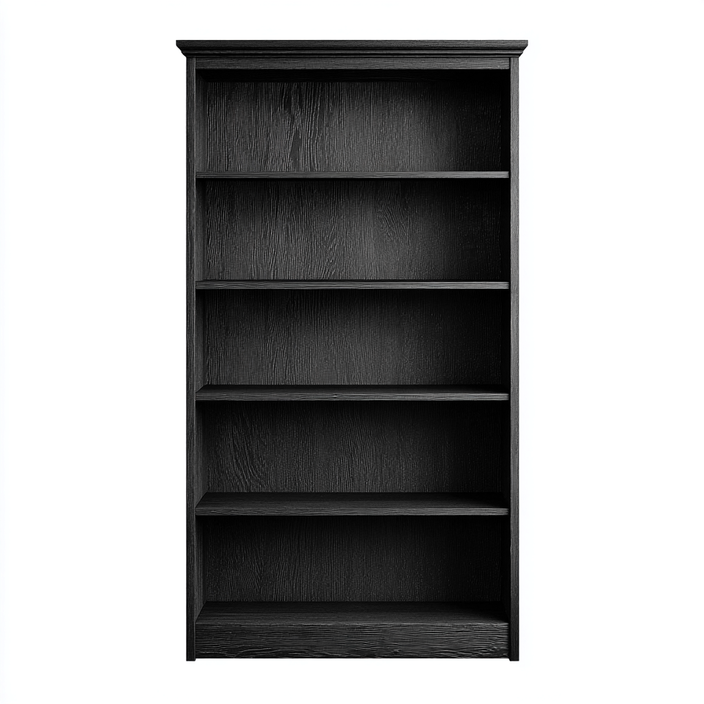 Esta estantería de estilo clásico presenta una estructura en color negro con una apariencia sobria y elegante, adecuada para la organización de libros, elementos decorativos y objetos cotidianos.
