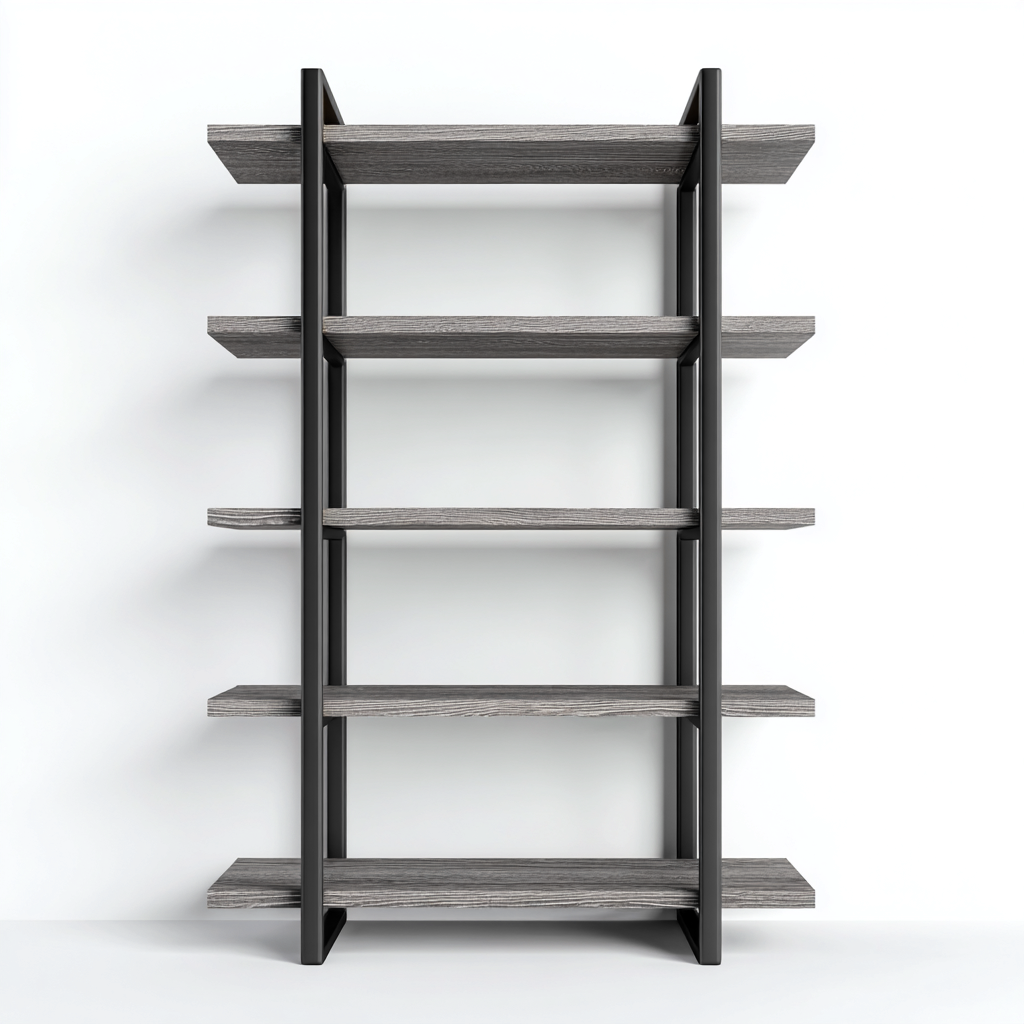 Esta estantería moderna combina baldas de madera en tono gris con una estructura metálica negra, ofreciendo un diseño estable y funcional para el almacenamiento en el hogar.