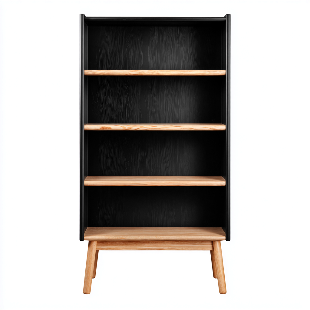 Esta estantería de estilo moderno combina una estructura en acabado negro con baldas en tono madera natural. Su diseño abierto ofrece una solución funcional y estética para organizar libros, decoración y objetos cotidianos en salón, despacho o dormitorio.