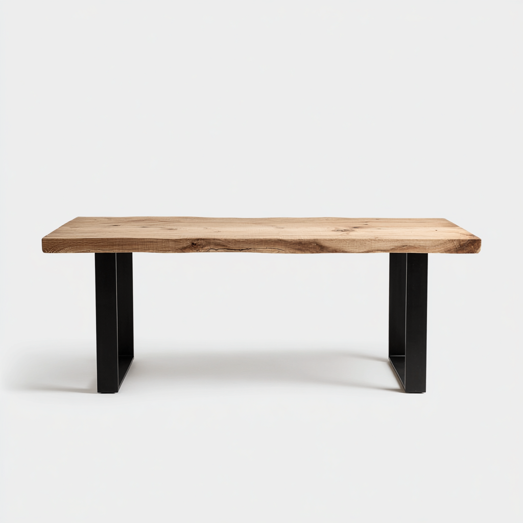 El tablero está fabricado en madera maciza con vetas y contornos naturales visibles, manteniendo un aspecto auténtico. La base consta de patas metálicas negras con acabado mate, garantizando solidez y una apariencia industrial equilibrada.