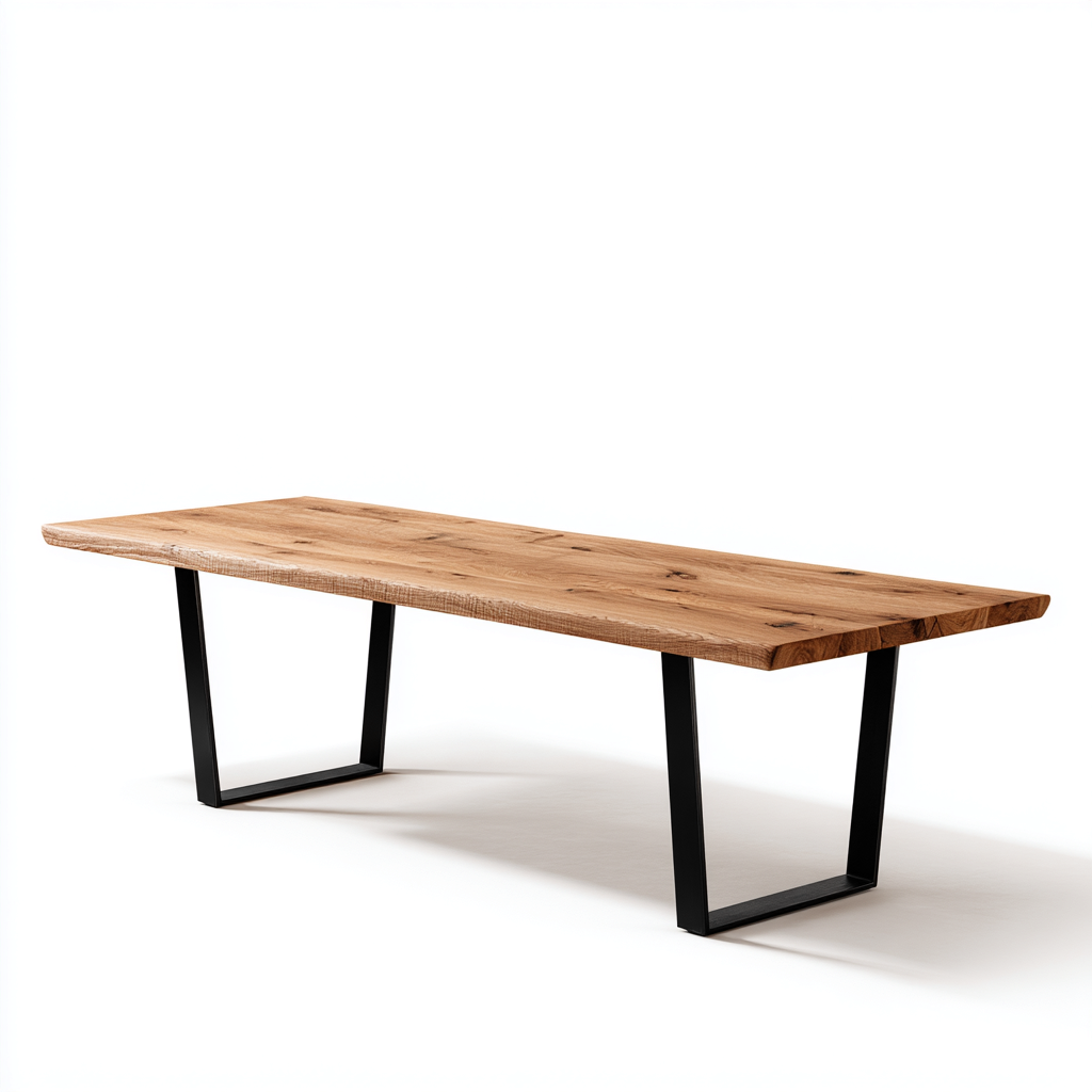 El tablero está elaborado en madera maciza de roble con contornos naturales y acabado protector. Las patas metálicas negras tienen estructura rectangular inclinada, ofreciendo una estabilidad sólida y un diseño limpio.
