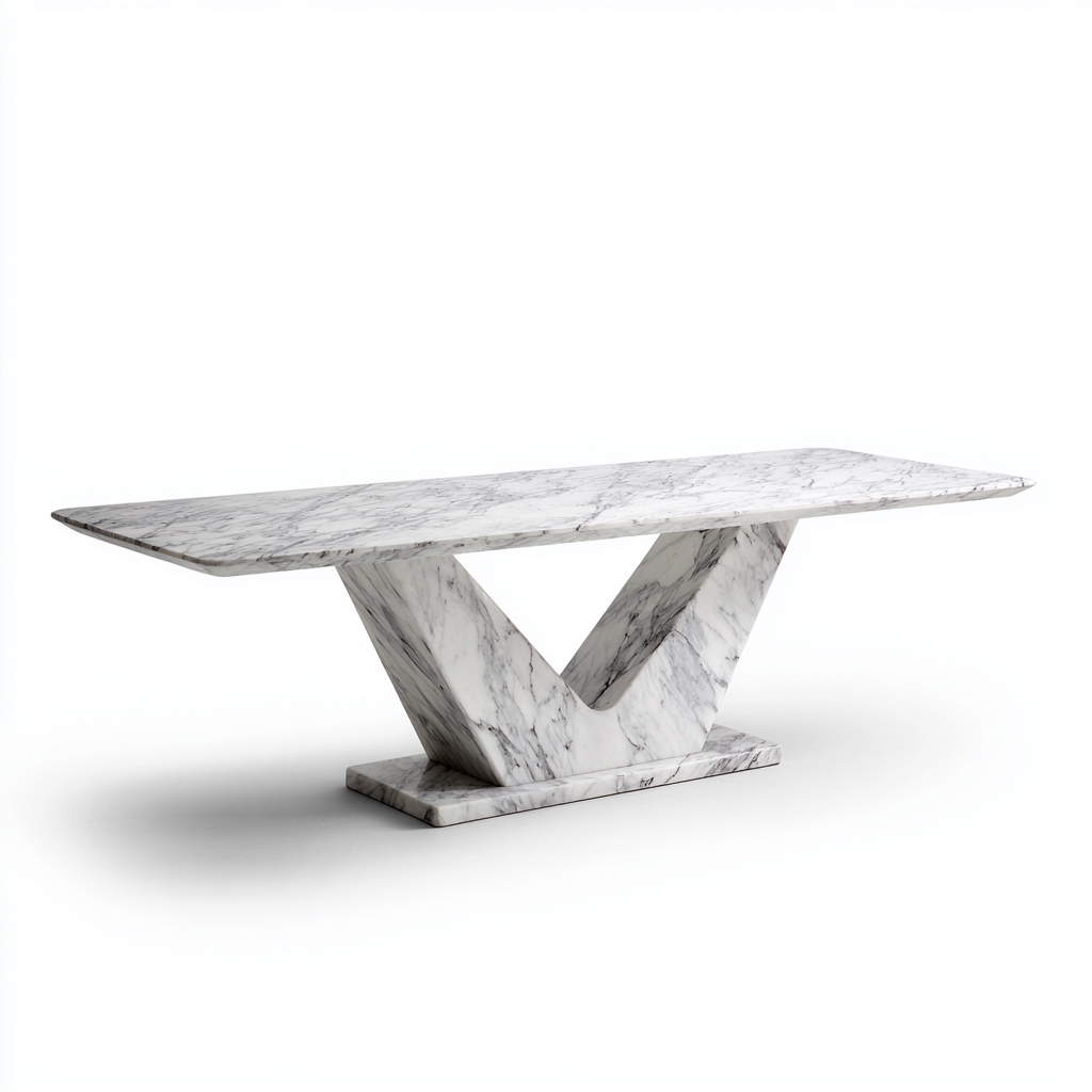 La mesa está realizada en mármol macizo con superficie pulida, caracterizada por vetas naturales en tonos grises. La base en forma de “V” proporciona un soporte estable y aporta un diseño distintivo.