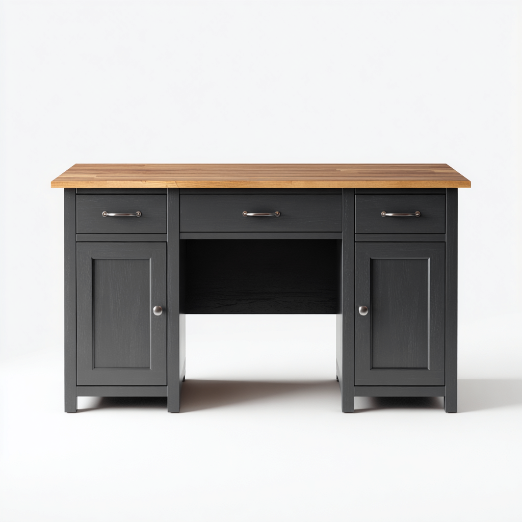 Esta mesa de oficina ofrece un estilo clásico y funcional, ideal para despachos y espacios de trabajo domésticos. Su diseño simétrico y su estructura robusta aportan estabilidad y una estética equilibrada al entorno.
