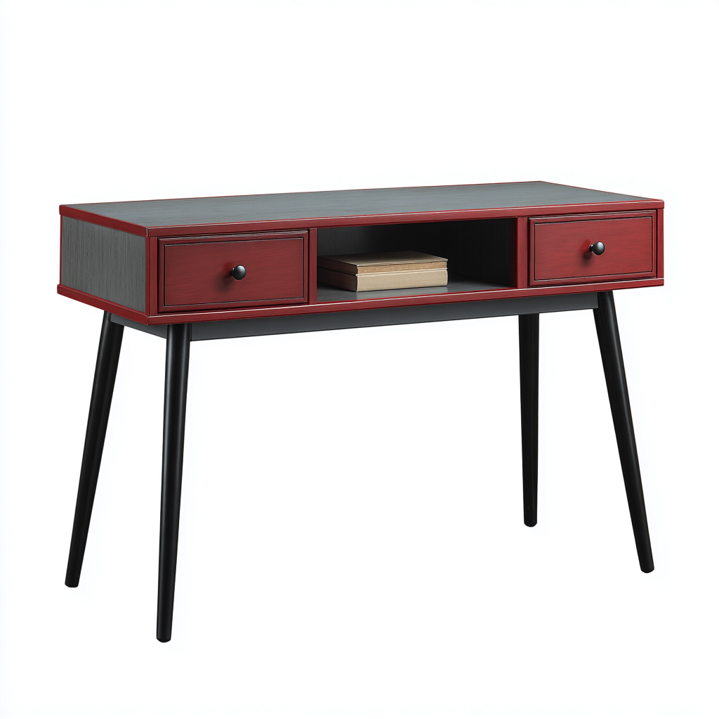 La estructura está fabricada en madera con acabado en color rojo y detalles en negro, complementada con patas metálicas de tono oscuro que aportan estabilidad y un estilo contemporáneo.