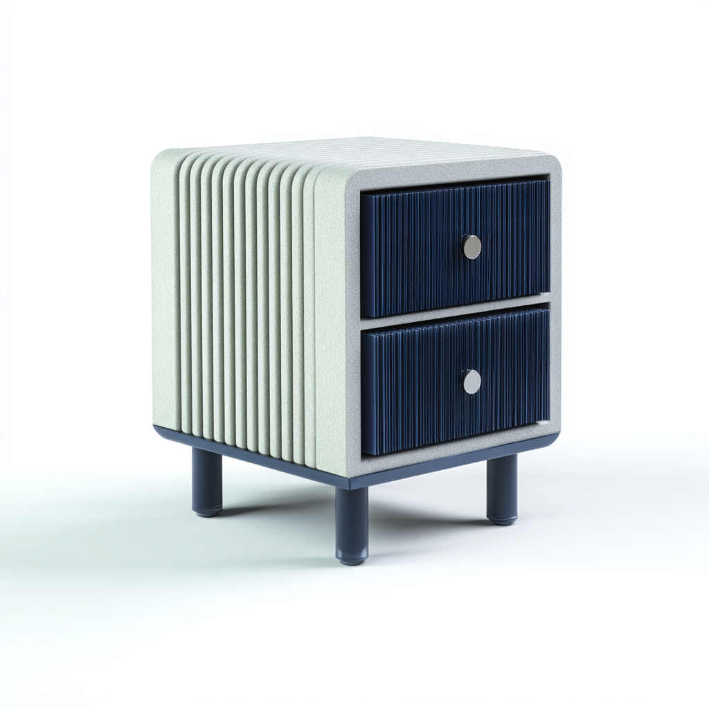 Esta mesita de noche moderna combina una carcasa gris con frentes de cajón en azul con textura acanalada, ofreciendo un estilo distintivo y práctico para el dormitorio.