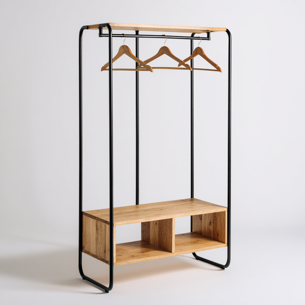 Este perchero con zapatero combina una estructura ligera y funcional que permite organizar prendas, bolsos y calzado en un solo mueble. Su diseño minimalista lo hace ideal para recibidores, dormitorios o espacios reducidos.
